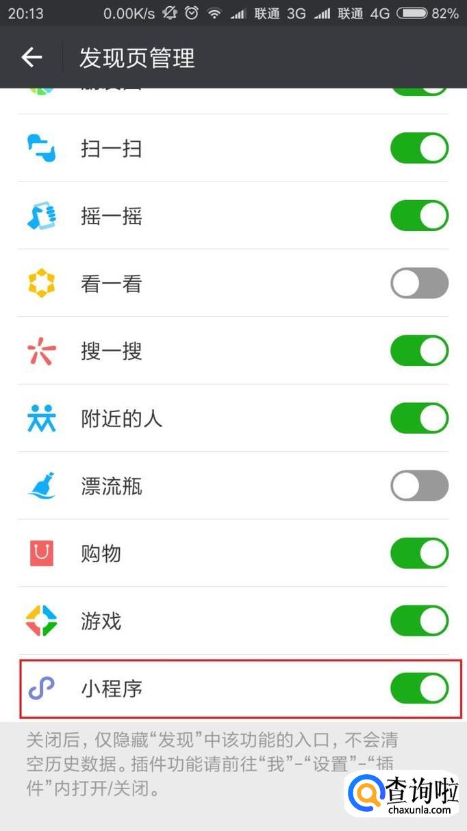 最后,可以看到“小程序”按钮开关,点击将其开关打开,这样,就可以在消息页面中看到小程序功能页面了。