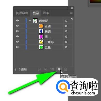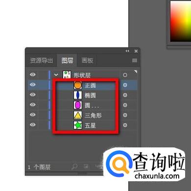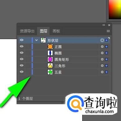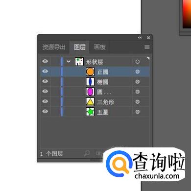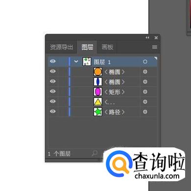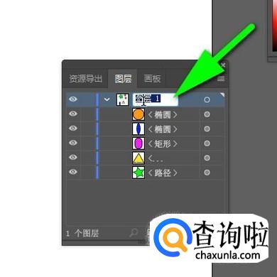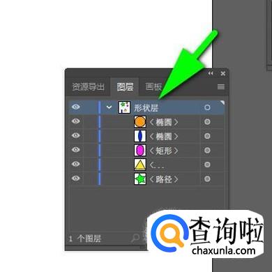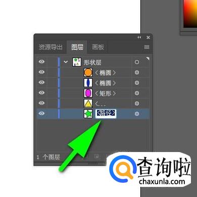 当前“图层1”是默认自动显示的,在“图层1”下面就显示着刚才绘制的5个对象,每个形状右侧都跟着有名字。接下来,我们把“图层1”命名为“形状层”。鼠标双击“图层1”这里,随即显示出编辑框状态。接着,直接输入“形状层”;按下回车键确认即可。