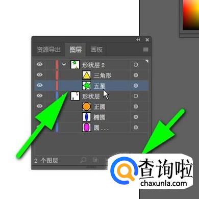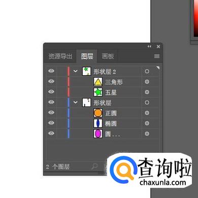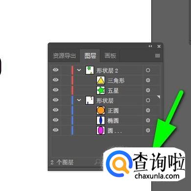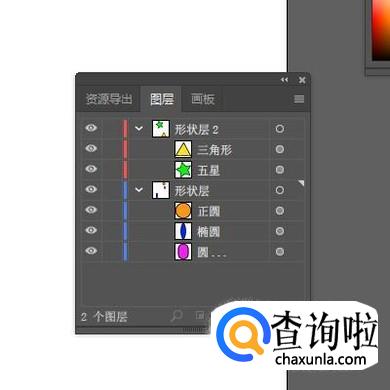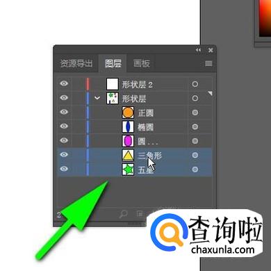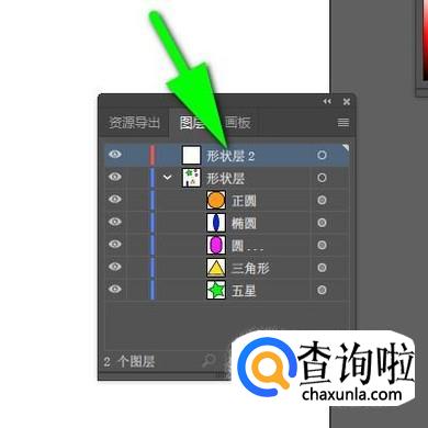 “五星”和“三角形"就全选中后,鼠标点住,向“形状层2”这里拖,放在“形状层2”上面,再松开鼠标。看!,“形状层”的“五星”与“三角形”不见了。而展开“形状层2”时,“五星”与“三角形”就显示在内。那么,分组成功了。