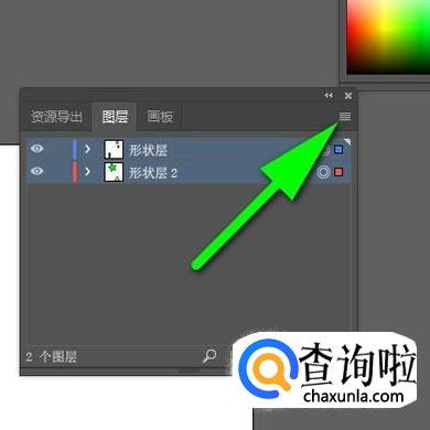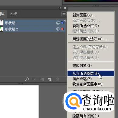 鼠标点住“形状层”,选中这层,再按键盘的SHIFT键,鼠标再点“形状层2”,执行加选,那么, 这两层就选中了。接下来,鼠标再点图层小面板右上角按钮。如下图所示。