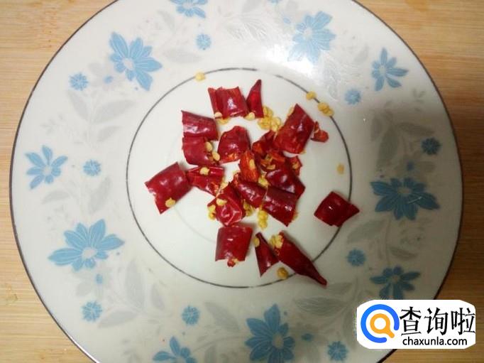 红干椒用水清洗干净,控干水分,切成小段。