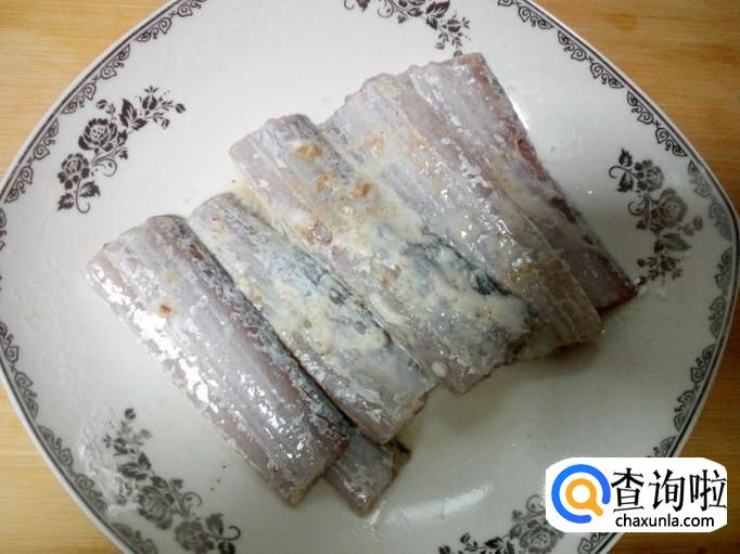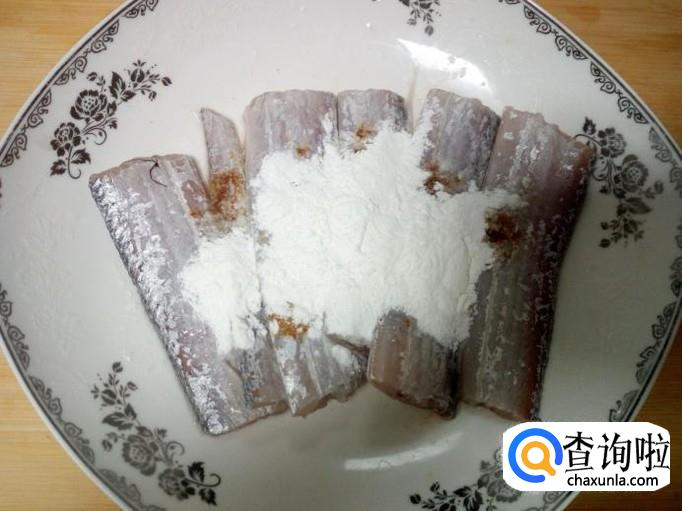 把腌制好的刀鱼,放入淀粉,拌和均匀挂糊。