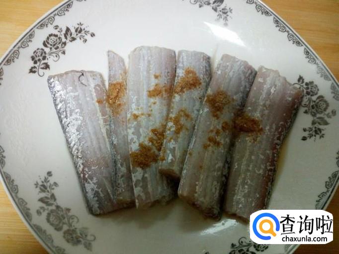 刀鱼收拾清洗干净,控干水分,切成段。放入少许盐,五香粉,料酒,腌制十分钟。