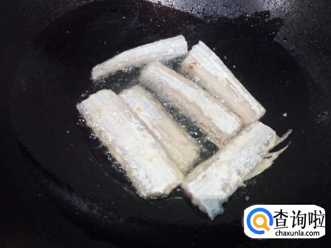锅里放入油加热,油热后放入刀鱼小火煎塌,煎塌至外表焦黄,盛出备用。