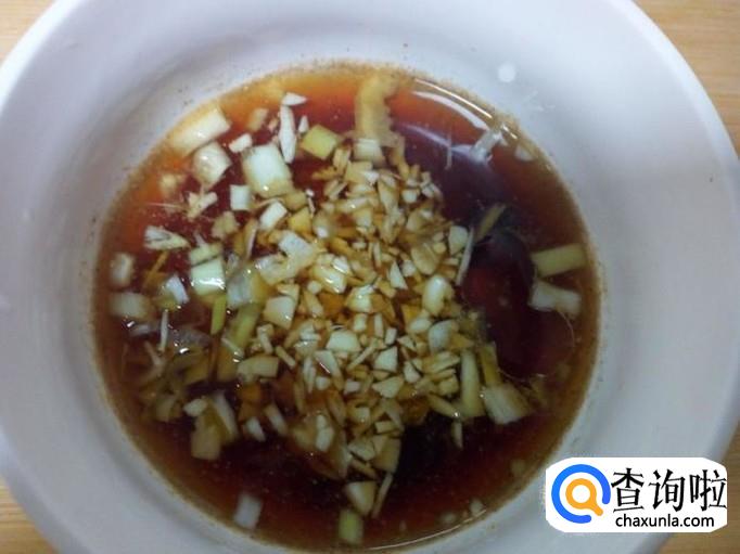 碗里放入盐,味精,五香粉,酱油,蚝油,料酒,白糖,醋,兑入水,放入少许油,再放入切好的葱,姜,蒜,调和成料汁。