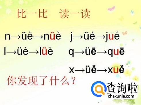 üe的发音方法也是这样的,从ü滑向e,ü读音重而有力,e读轻而短促。同样要进行一声,二声,上声和去声的练习。