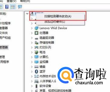然后右键点击选择页面中的计算机名称,在弹出的菜单中选择“扫描硬件改动”选项,让系统自动检测硬件设备对系统的改动。USB要一直插入电脑中。