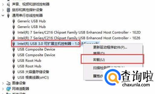 接下来,点击“通用串行总线控制器”然后右键点击其中的“USB3.0可扩展主机控制器”,然后在弹出的菜单中选择“卸载”按钮。