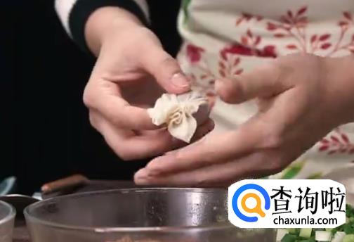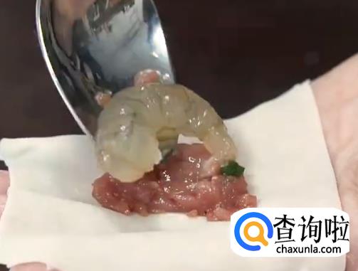 每片云吞皮里加猪肉馅和一条虾仁,用虎口收口再捏紧。