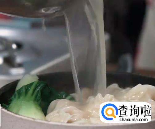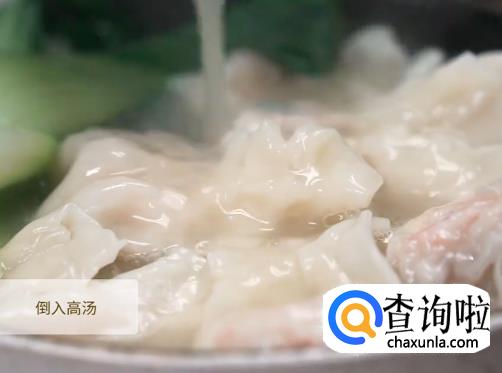 煮好的云吞,面条和青菜捞出装碗,倒入高汤。