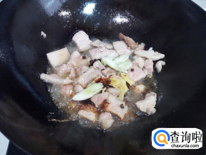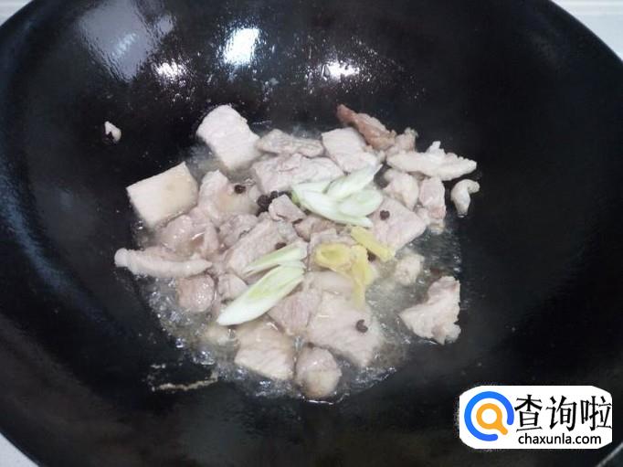炒至肉下猪油,颜色微白,放入葱,姜,翻炒。放入料酒,少许蚝油。