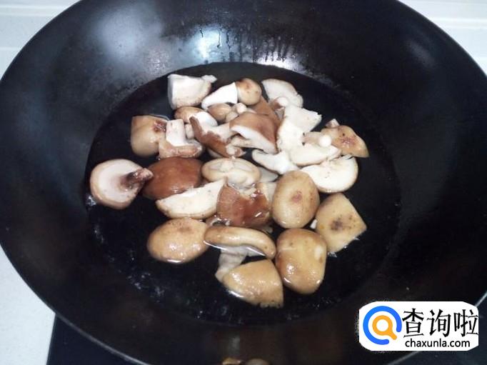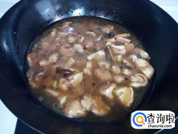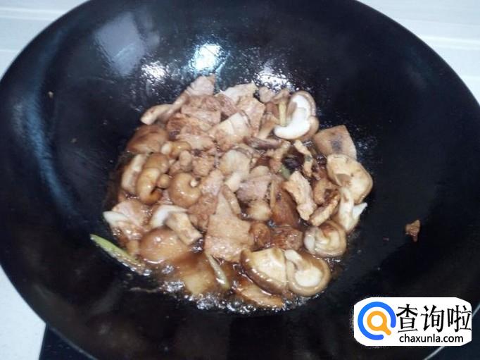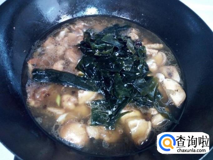 放入香菇翻炒,放入少许酱油,盐。香菇略翻炒一下,放入适量的水,放入海带,大火烧开,转小火慢煮。