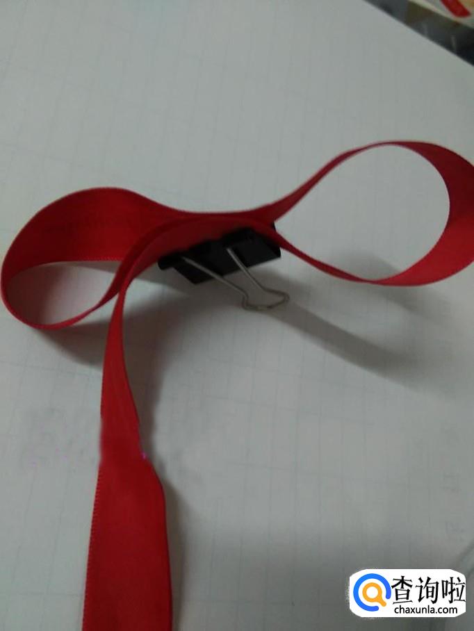 把彩带的头放在下面,向左绕一个套,彩带头留在右面。