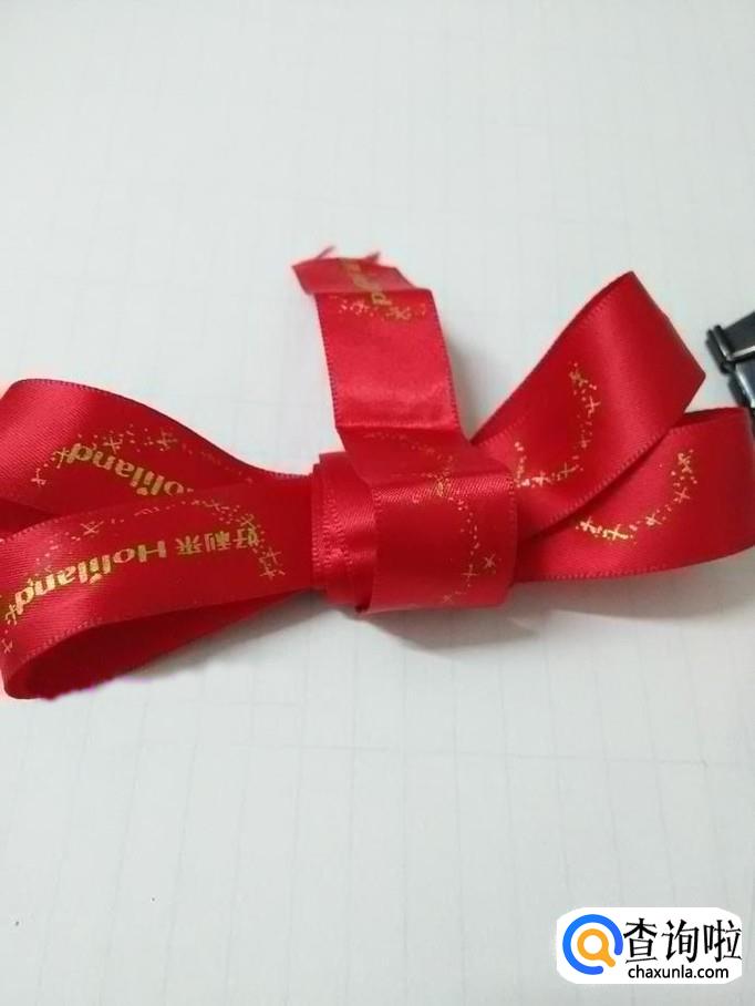 将带子头绕到最后,向横处折一下,塞到蝴蝶结里面去。