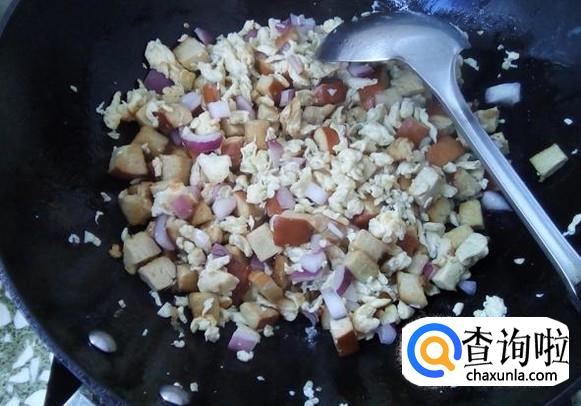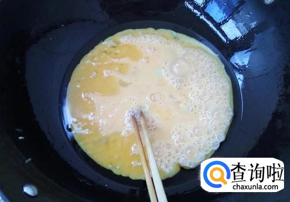 锅内放入适量底油,油温8成热时倒入鸡蛋液,然后不停用筷子搅动,使鸡蛋成小块状。