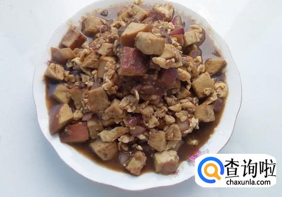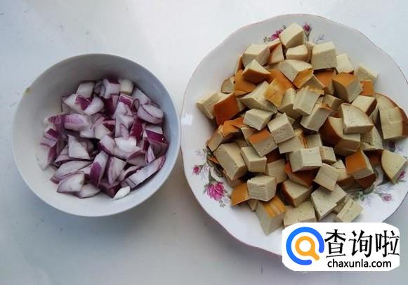 然后分别放入圆葱丁和豆腐丁一起翻炒。
