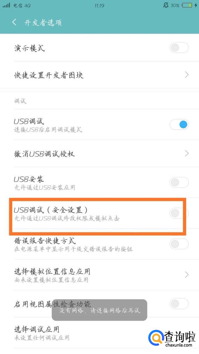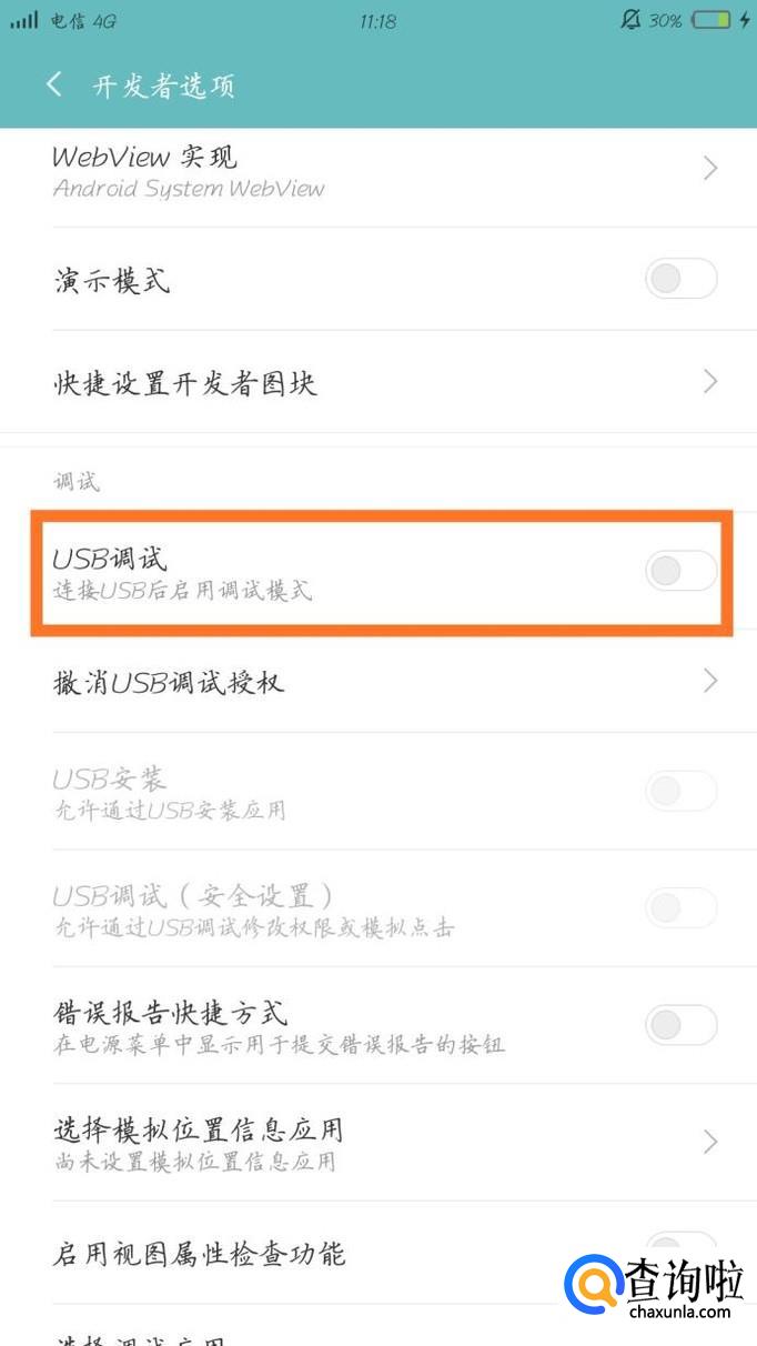 在开发者选项里面先找到第一个"USB调试",点击右侧半蓝按钮打开。
