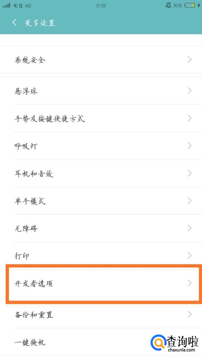 设置往下面拉,在"更多设置"里面找到"开发者选项",如图。