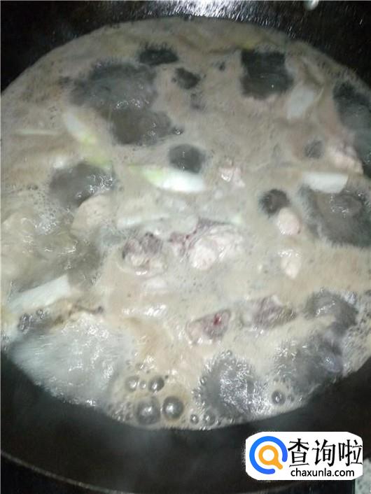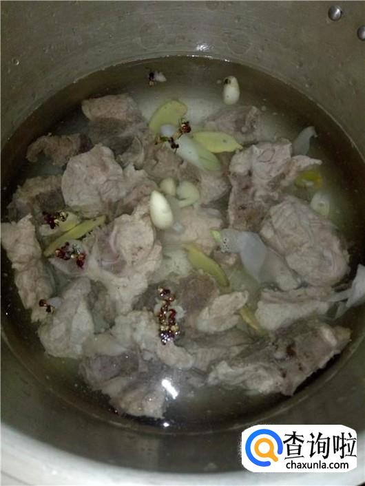 加入姜片、蒜冷水入锅开始熬汤,小编还加了些花椒和枸杞。