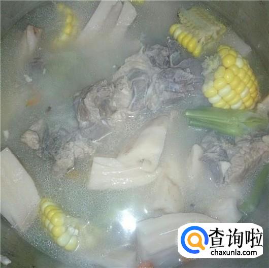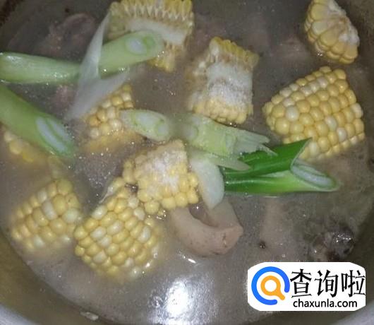 关火,等高压锅压力平衡后揭开,加入少许葱还有准备好的玉米,适量的盐,再次熬上十分钟。小编买的那颗葱太大了,一起丢了进去,但愿不会破坏味道。