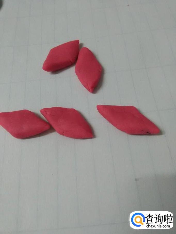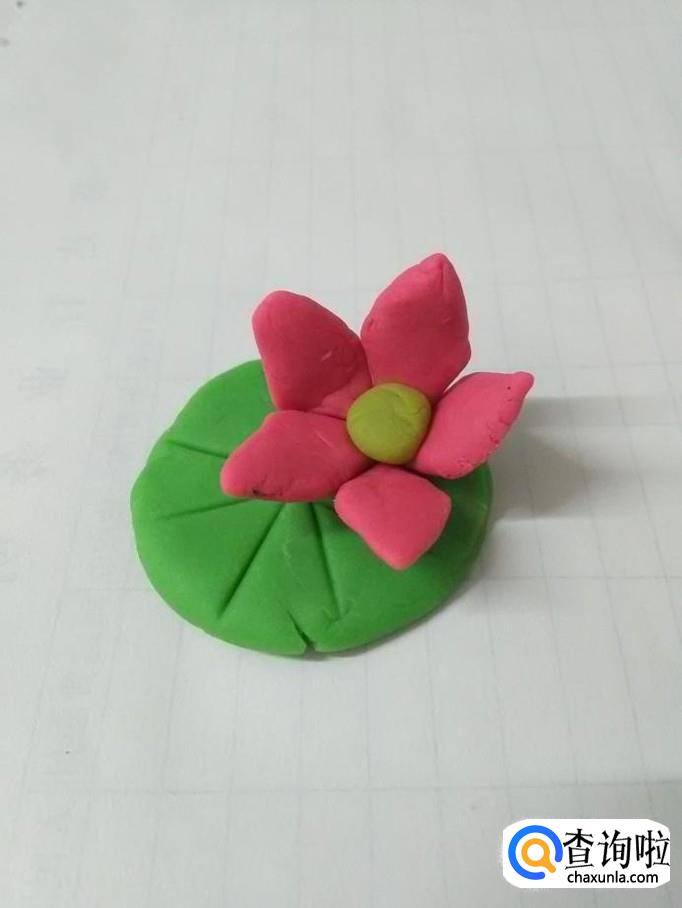 用粉色捏五个菱形,当作荷花的花瓣,把五片花瓣粘在黄色的花心周围,彩泥荷花就做完了。