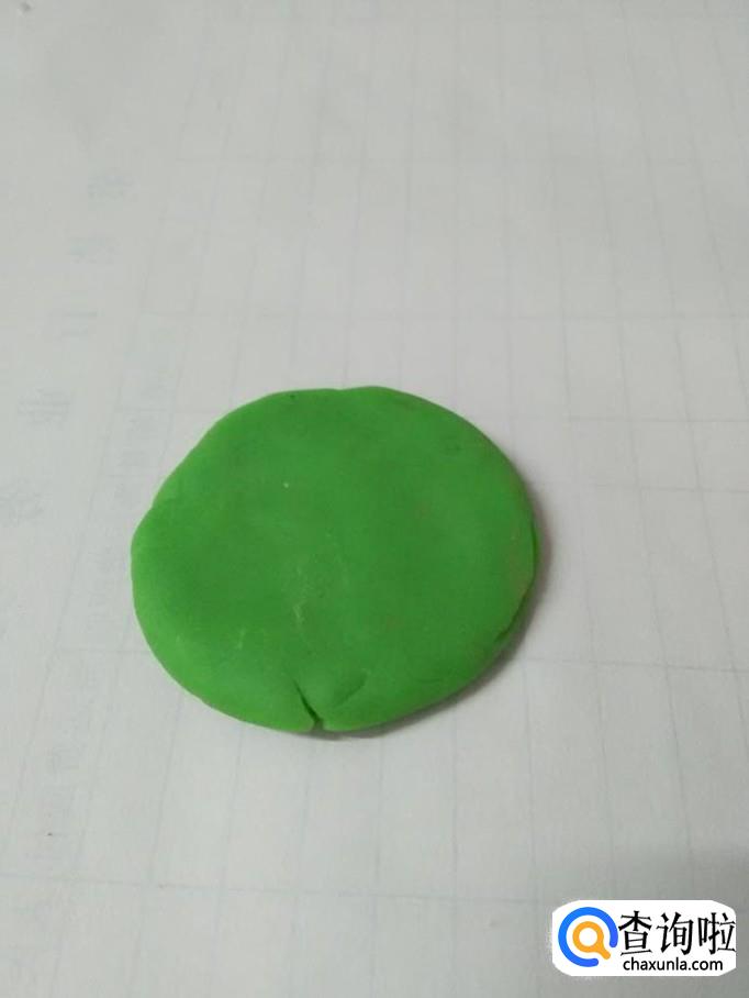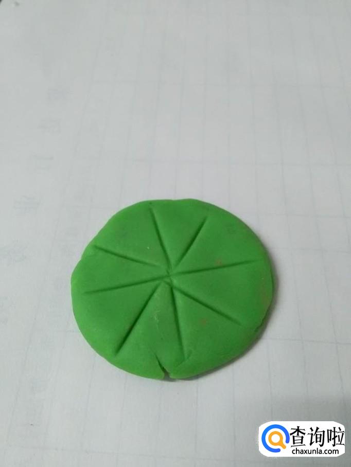 先将绿色彩泥在手里团成圆球,再按成圆形扁片,当作荷叶。