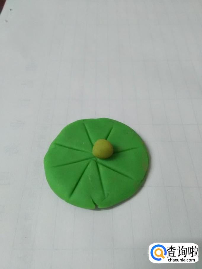 用黄色彩泥团成一个圆球,粘在荷叶上面,当作荷花的花心。