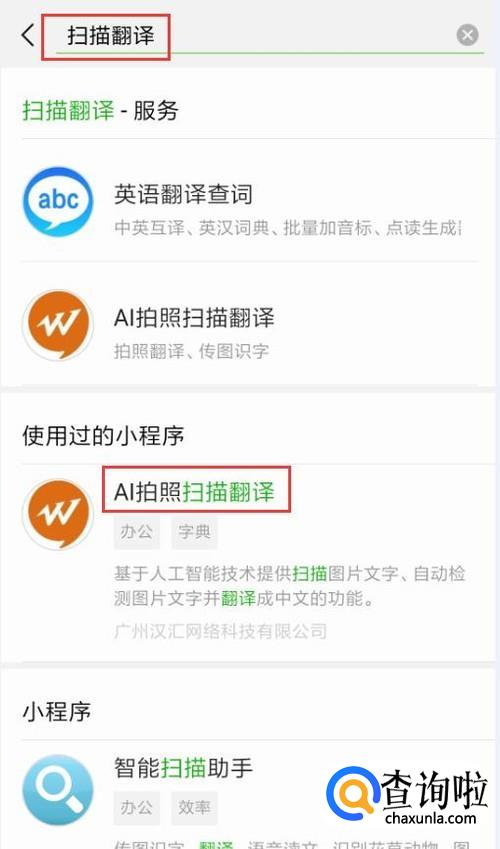 在小程序里面搜索“扫描翻译”,选择一个搜索结果。
