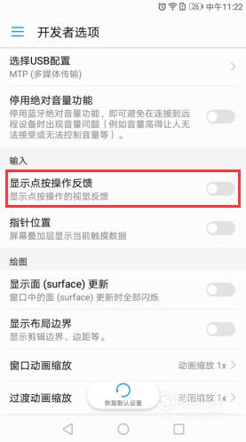 进入开发者人员选项页面后,在“键入”一栏下找到【显示点操作反馈】,关闭后面的按钮。这样,屏幕上的触屏白点就消失了。