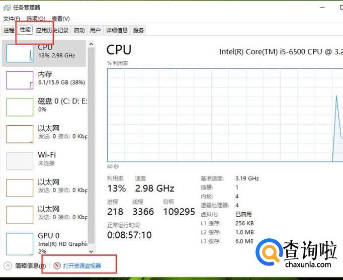 首先按下Ctrl+shift+C组合键打开资源管理器,如下图所示,选择性能,然后点击打开资源监视器