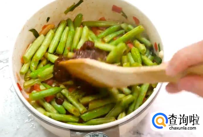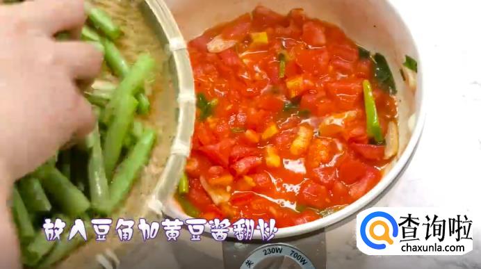 直到番茄丁炒成浆糊状时,把豆角放进去,再加入适量黄豆酱,一起翻炒均匀。