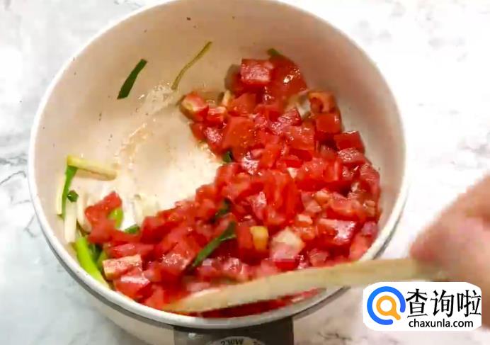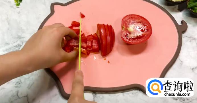接着,将准备的葱切成段,蒜切成片,番茄切成丁。