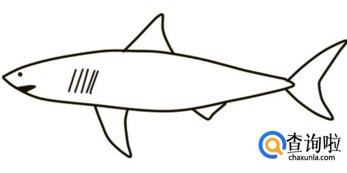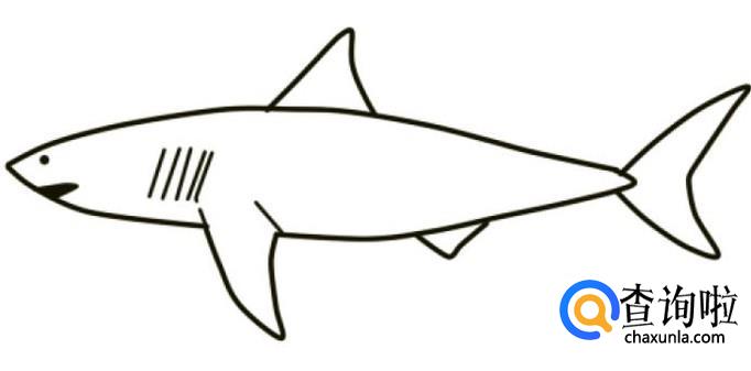 在鲨鱼背鳍下面,画五条竖线,表示腮。