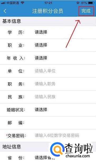 按照要求填写注册积分会员所需的各种信息,填写完毕后点击右上角的完成。