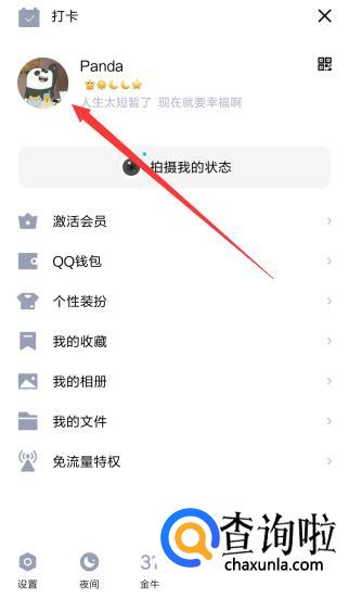 然后我们手从屏幕左边划向右边,来到手机QQ【设置界面】,点击自己的头像。