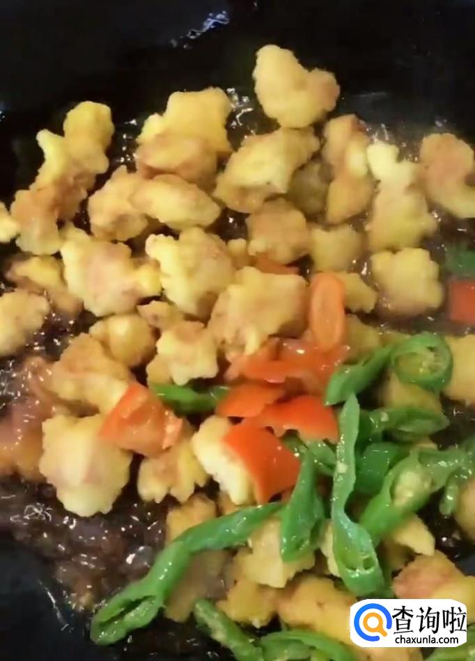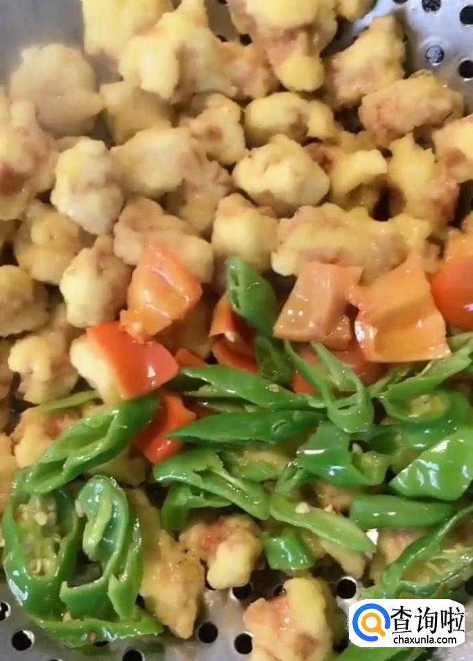 待油温升至八成热再次下入猪里脊肉复炸一下,炸至金黄酥脆,放入辣椒一起炸一下捞出备用