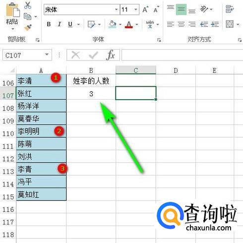 以下图表格数据为例,需要统计姓李的人数,结果显示在B107单元格。