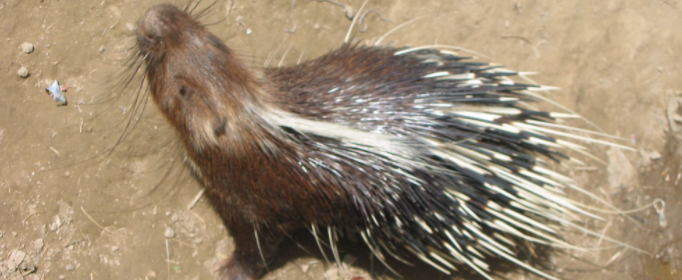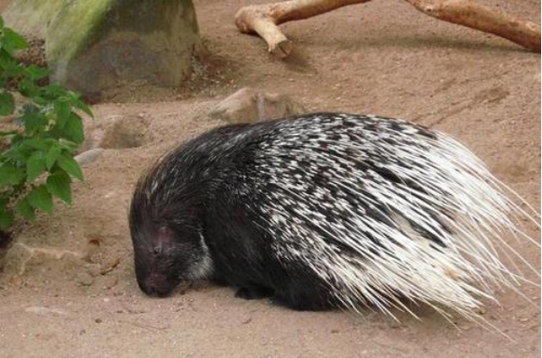豪猪又叫箭猪,广泛分布在我国的长江流域和西南各省。它的身体肥壮,体重十几公斤,个儿大的身长可达0.7米,牙齿锐利,头部有点象老鼠,全身棕褐色,从背部直到尾部披着簇箭一样的棘刺,臀部棘刺长而集中,短小的尾巴几乎全被掩盖。它身上最粗的长刺象筷子,呈纺锤形,最长的可达米,每根刺的颜色是黑一段白一段,黑白相间的。
