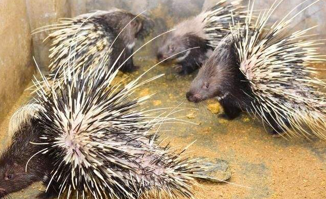 豪猪是夜行性动物,白天藏在山坡、草地或密林中的洞穴里,晚上出来找食,有时成小群活动。它们每年繁殖一次,每次产仔2〜4只,刚生下的小豪猪的刺是软的,但很快会变硬起来。