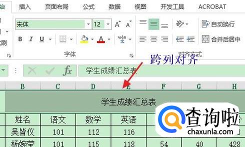 跨列对齐很多人也不是太常用,但是如果我们是在制作一些图表类表格时,这个功能非常适用,比如下图是一张学生成绩表,加入我们想要在最上方插入一行“学生成绩汇总表”,多数人可能会先将上面的单元格合并,然后再输入文字内容,其实不用那么麻烦,我们只需在任意一个单元格输入文字,如图...