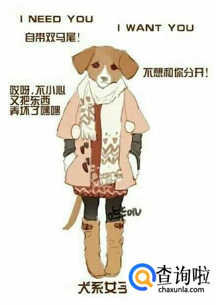 犬系女子一般自带双马尾,喜欢撒娇,具有丰富的情感。最喜欢说的话就是我不想和你分开了,喜欢黏人。有时候又有些粗心大意,总是容易把一些事情办错。