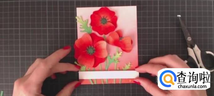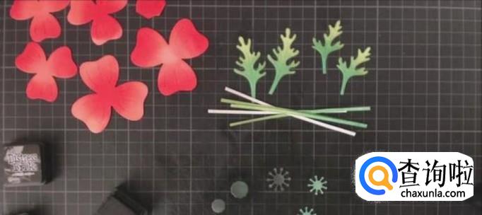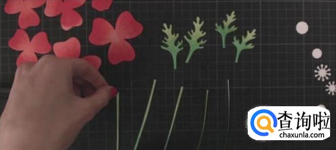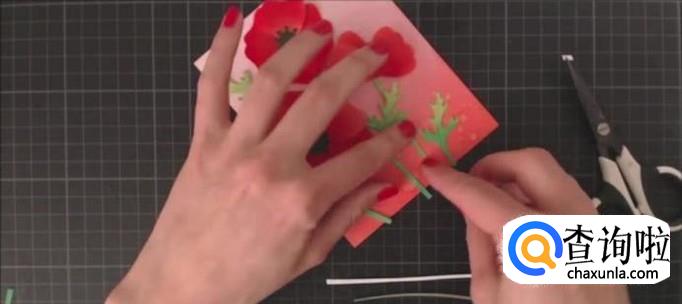 然后我们再用胶水将绿叶和花朵按照顺序贴好在贺卡封面上。