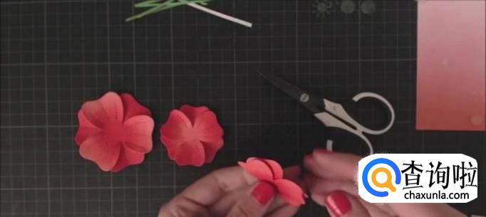 然后我们再将绿叶粘好,将花瓣重叠粘成花的形状。