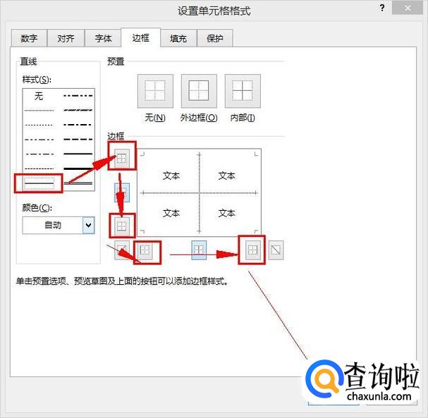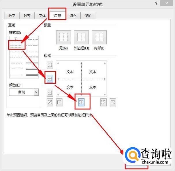 在弹出的界面中,选择“边框”,选择虚线命令,分别为表格中横向和竖向添加。添加完毕后点击确定。