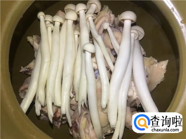 把海鲜菇、鸡肉、老姜,一起放入锅中,加入适量的清水。