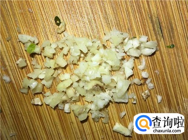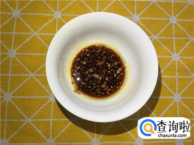 准备好两块蒜头,剁碎,放入碗中,再加适量的花生油、酱油、盐,搅拌均匀,弄一道酱料。