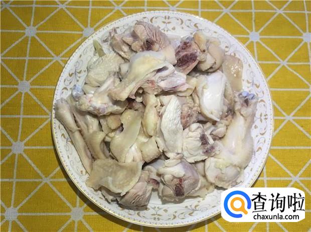 把烫过的鸡肉,再放入凉水中冲洗一遍,沥干水分,备用。