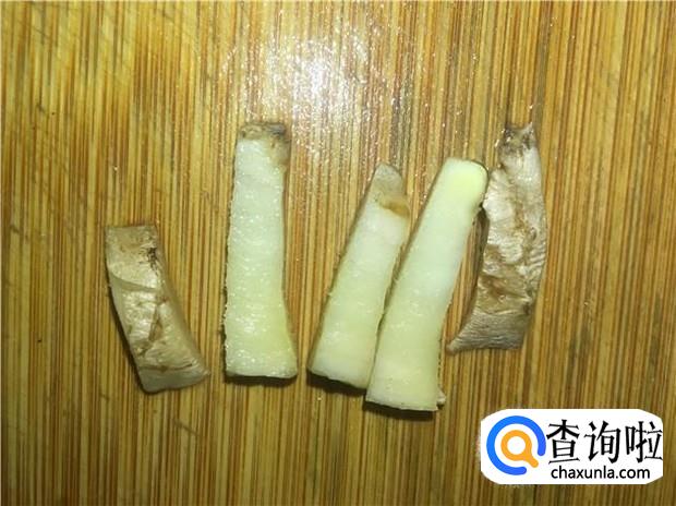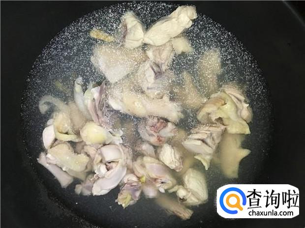 老姜清洗干净泥沙,切成姜片,锅里放入两片姜,烧开一锅水,水开后,放入鸡肉烫5分钟。