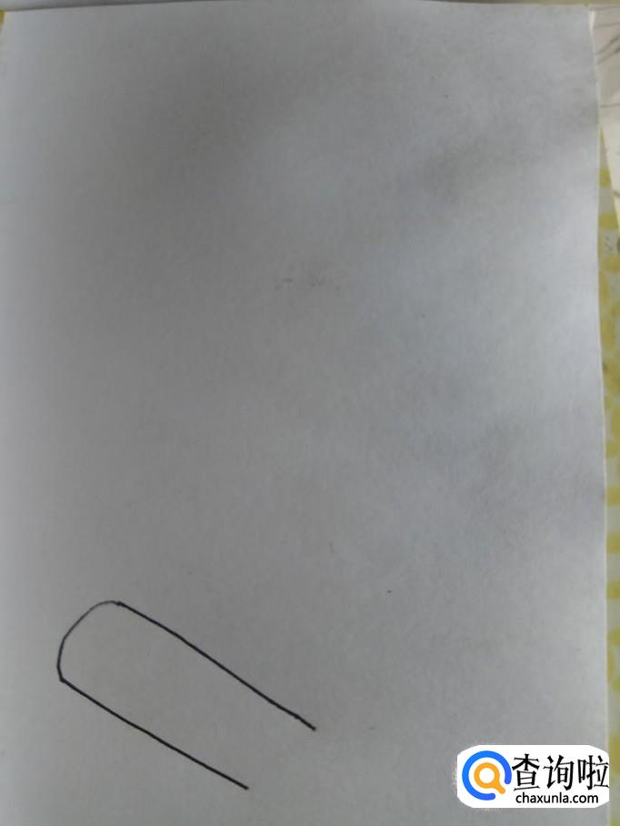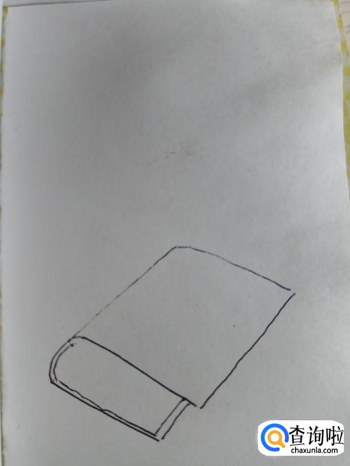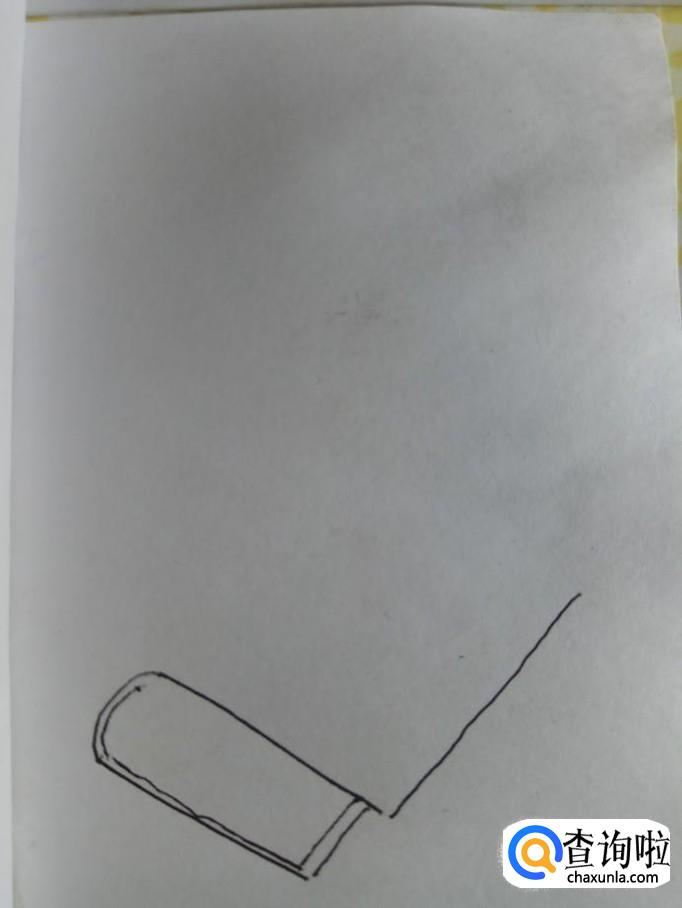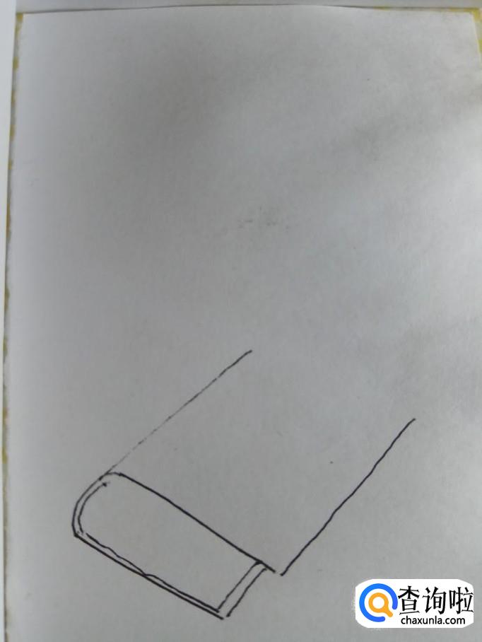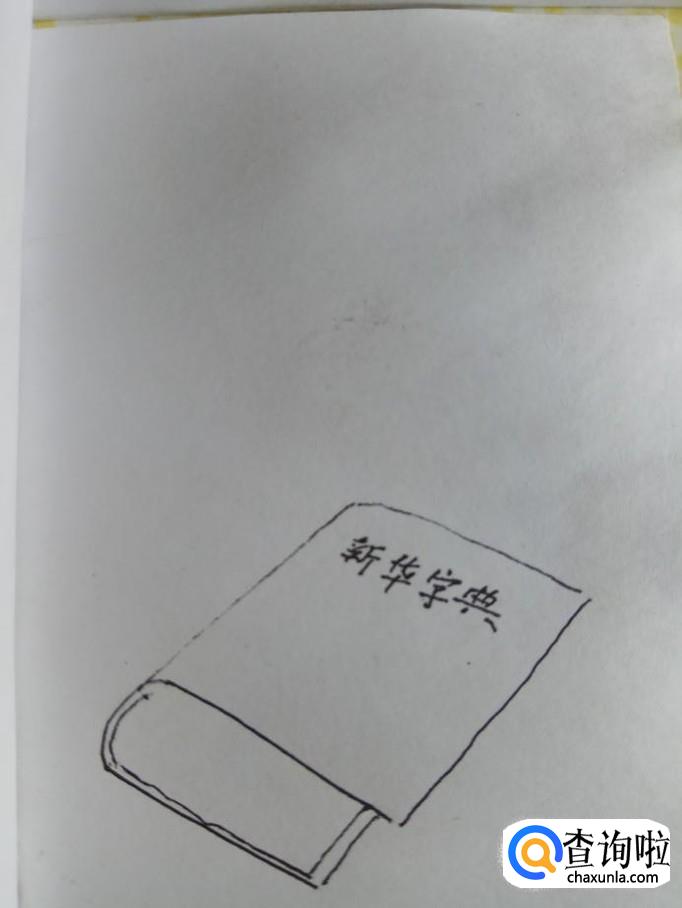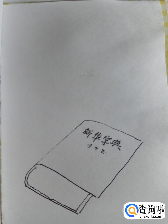 但白纸上用直线和弧线,画出新华词典侧面的形状,然后再画一条线,向右上方延伸。