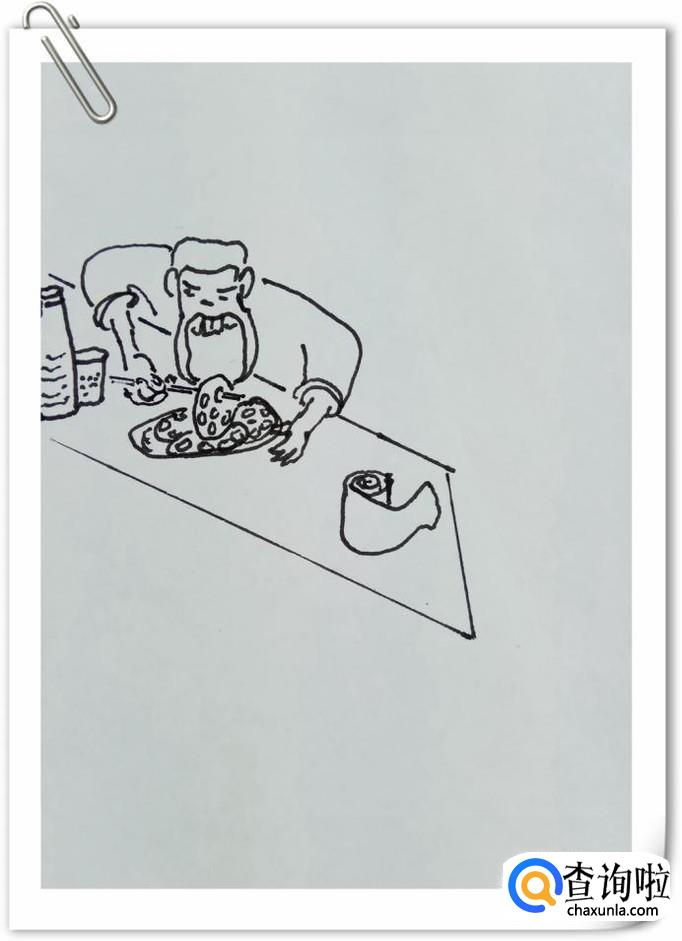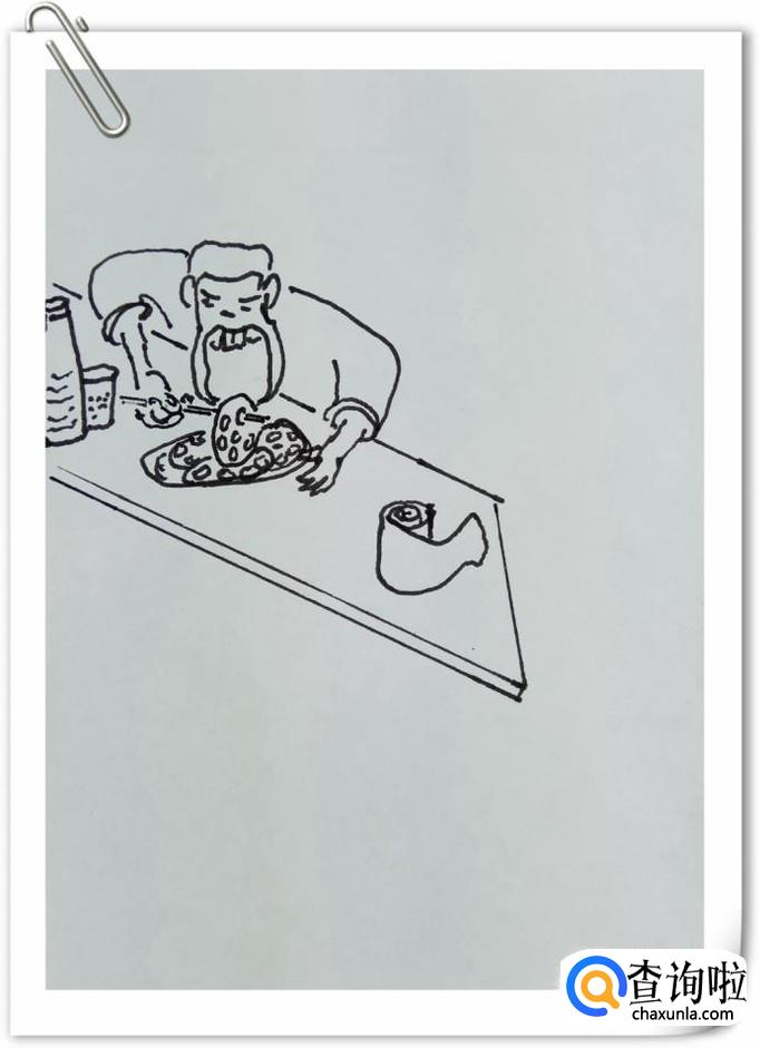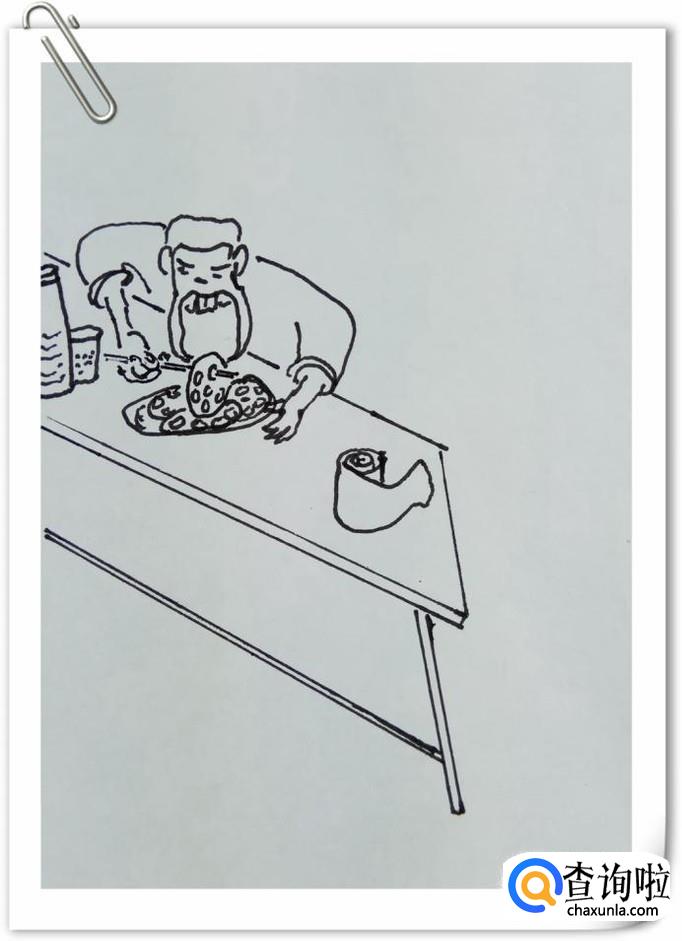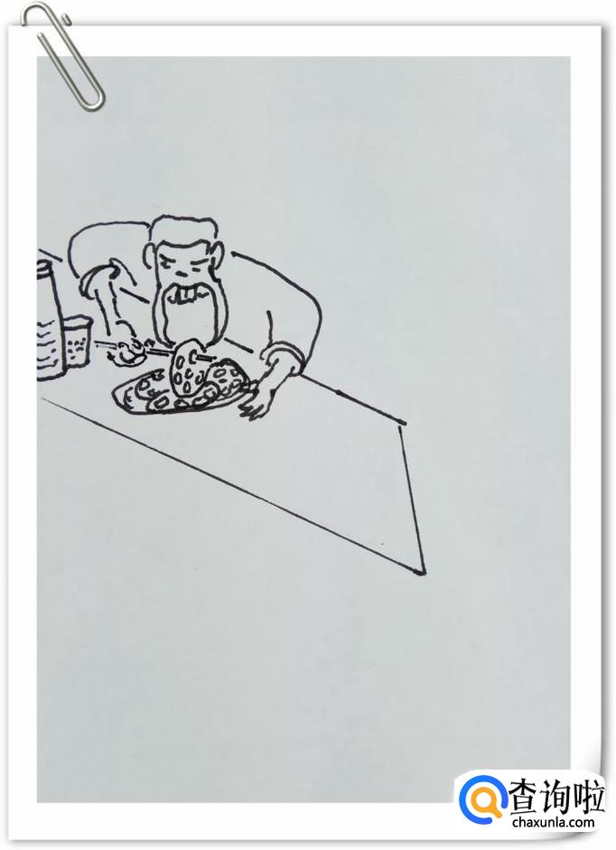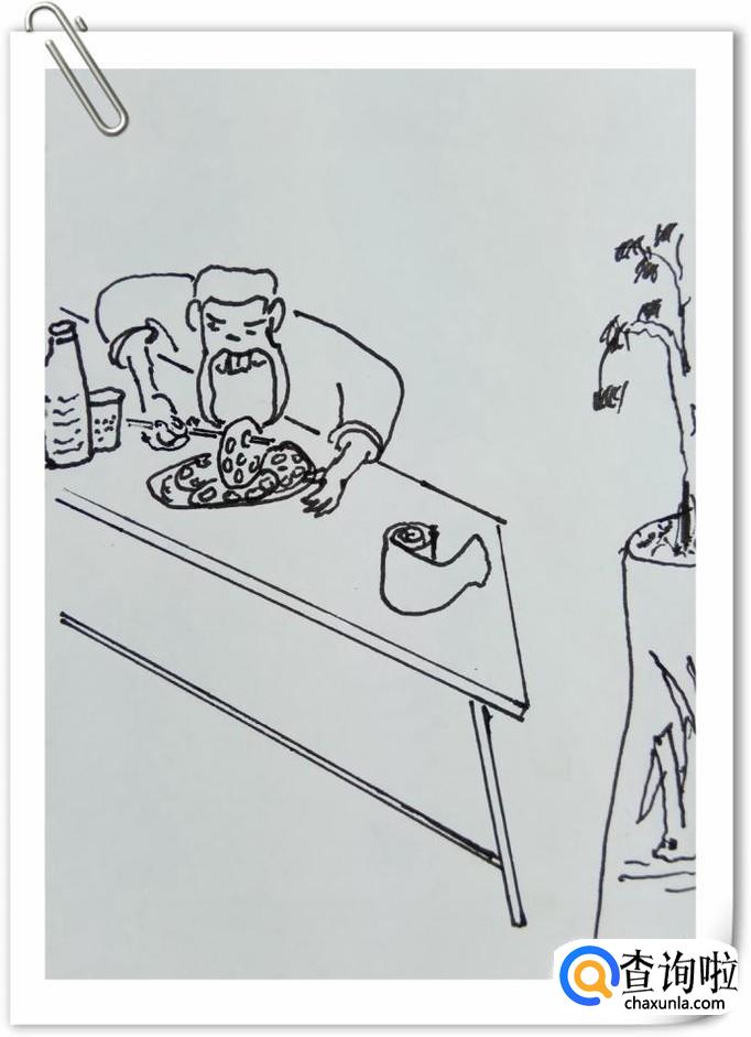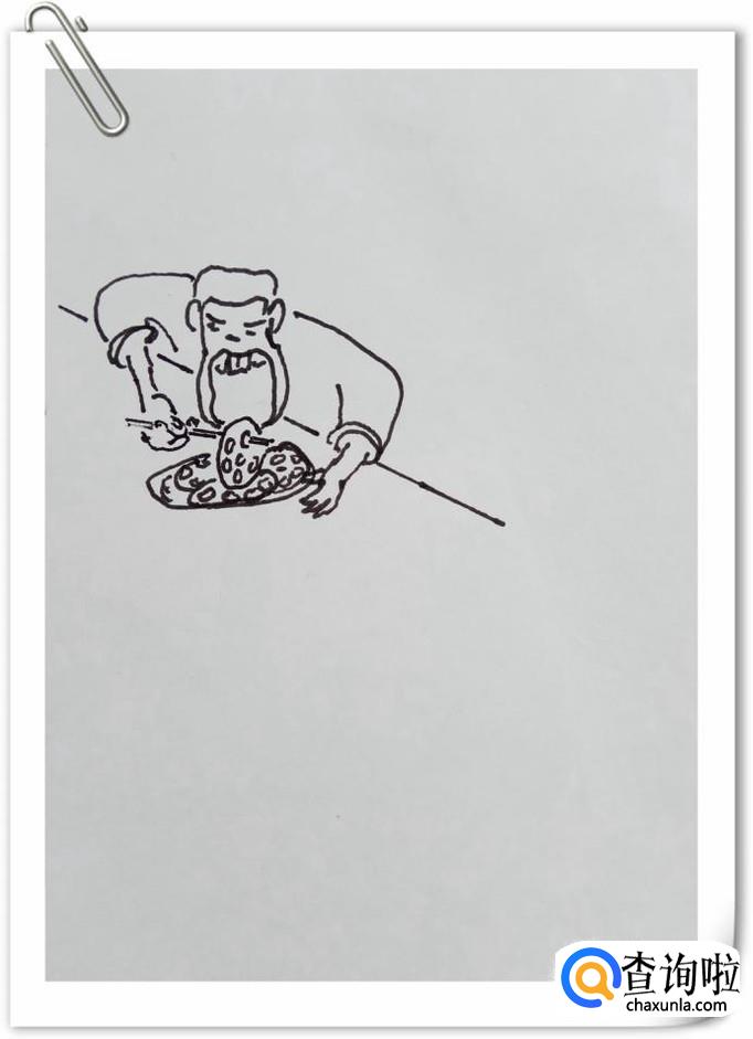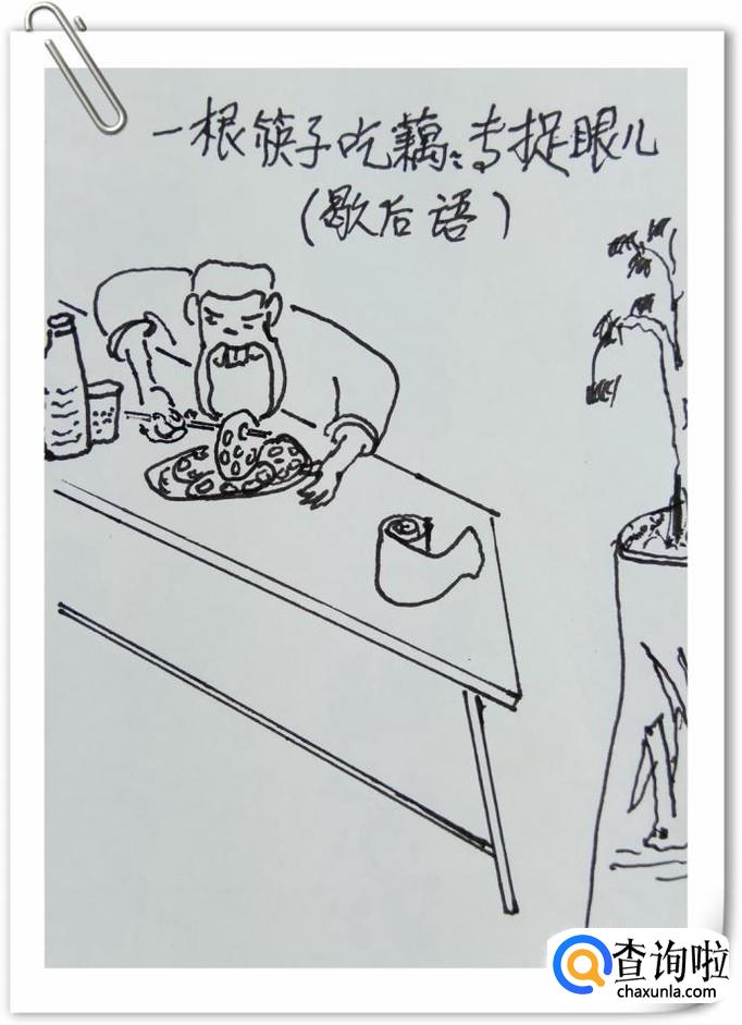 在白纸上用一些椭圆形画出一个盘子,然后再画出盘子里放着的藕片。再用曲线和线段画出拿筷子吃藕的人,可以将吃藕人的嘴巴画得相对夸张一些,你看他张大嘴巴想吃藕,可是却净挑眼,过于挑剔,自然吃的不快。